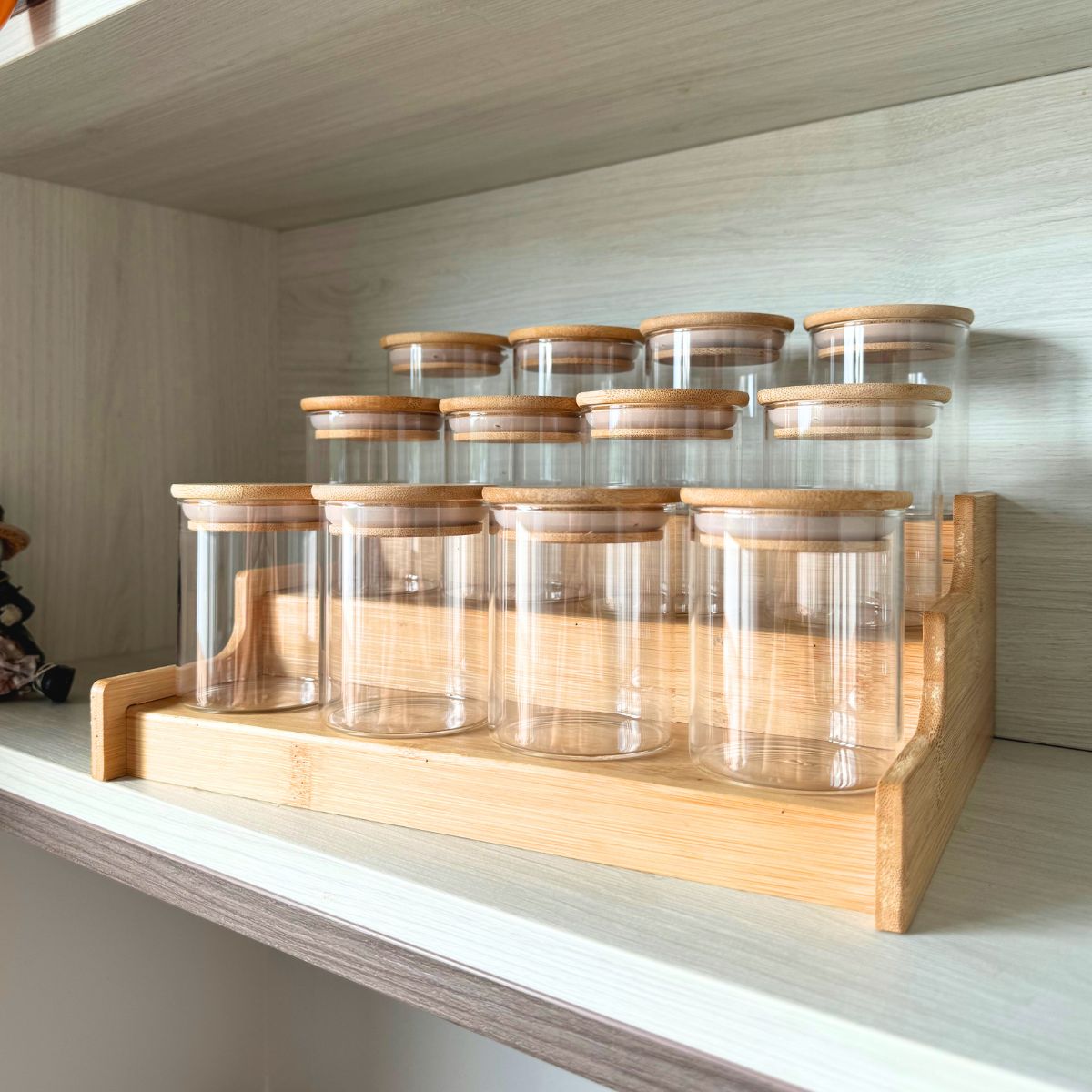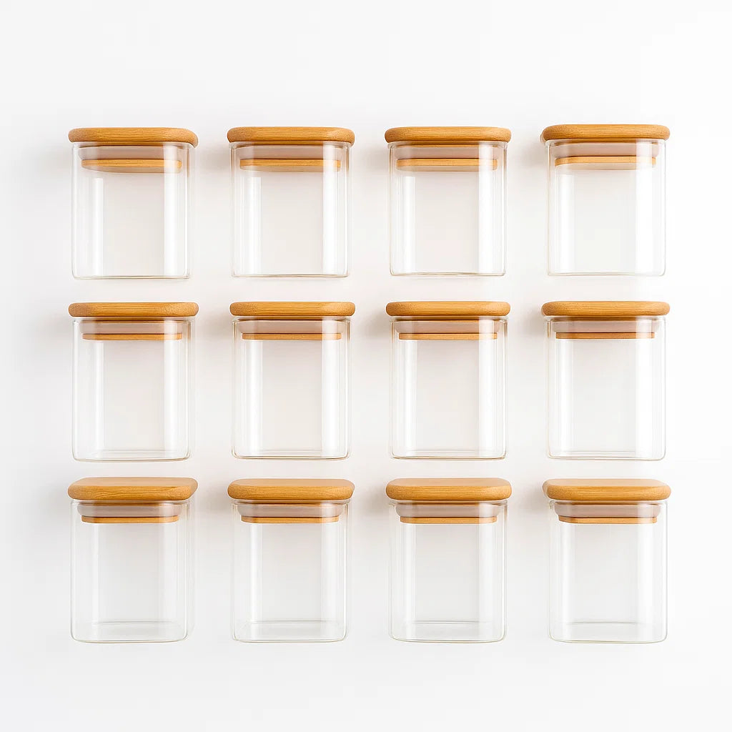 Kit VitaBela Premium - 12 porta temperos herméticos em vidro com tampa em bambu natural. A combinação perfeita entre funcionalidade e design clean que você sempre buscou.